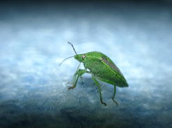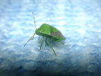 | カメムシって亀の形に似ているからそう言われているのかな?ほんと! 亀みたいにも見えるね。 | チャバネアオカメムシといって明かりに誘われてよく家の中にもやってくるんだよ。 目も複眼と単眼があってね。ちっちゃいのが単眼。どう見えているんだろうね? |