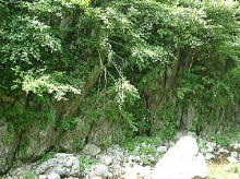 | 河内の風穴(ふうけつ) 人一人がかがんで入る入り口 でも中は大きな鍾乳洞 奥は三重県側に続いているとか?大きな鍾乳石はあまりなかったです 今日はここは前を通りすぎて先へ進みます | だんだんと水の流れが無くなってきます 地下を流れています 枯れ沢 石灰岩の色っぽさが目立ってきます | 大きな石灰岩がごろごろ 化石採取の人が岩を割った後もあります 三葉虫がでたところ |